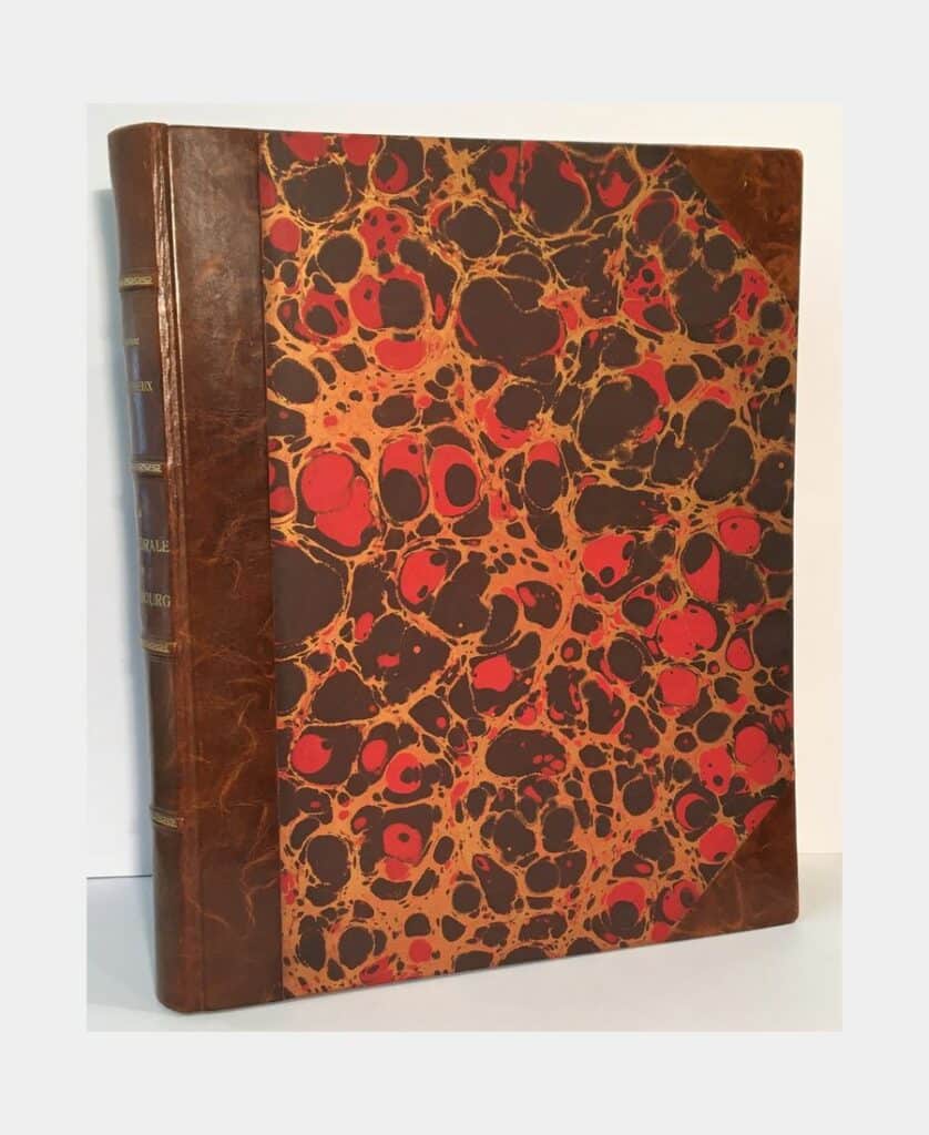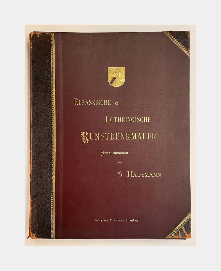 Strasbourg, W. Heinrich, (circa 1900) ; grand in folio, 1 f., 120 planches sous portefeuille d’éditeur, dos et coins demi-chagrin, premier plat titré. Epidermures, rousseurs éparses. Un volume seul, sans celui de texte. Album complet des 120 planches représentant des monuments, des détails d’architecture, des sculptures, d’oeuvres d’art (120 sur l’Alsace, 60 sur la Lorraine) en photogravures et phototypies issues des atelier de Jules Manias et de Fischbach.