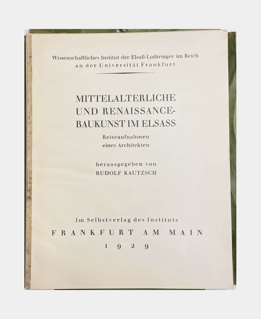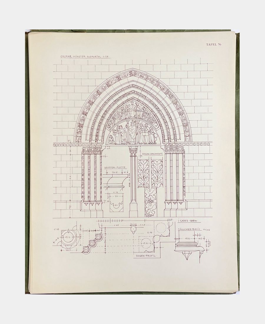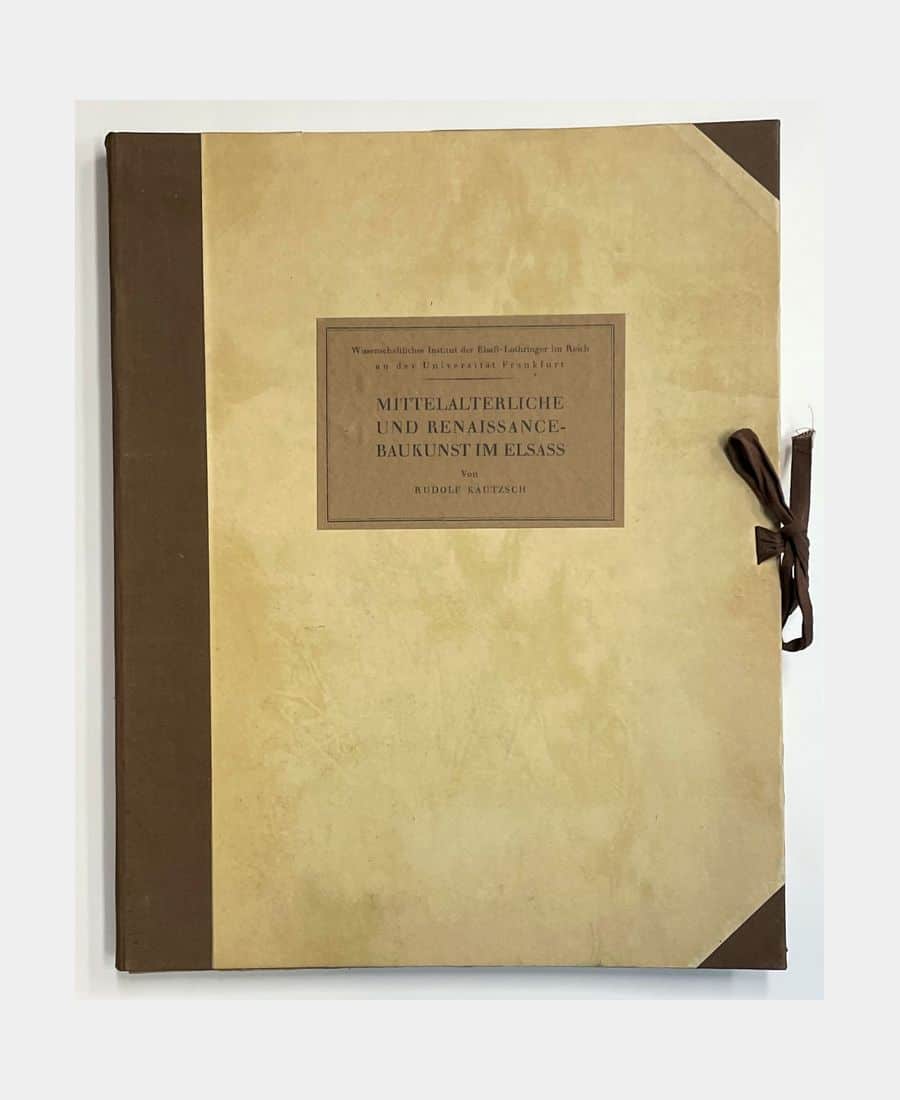 Frankfurt am Main, Im Selbstverlag des Instituts, 1929 ; in folio, 4 f., 106 planches sous portefeuille d’éditeur à lacets, dos et coins en toile marron, étiquette de titre sur le premier plat. Soufflets des rabats en papier du portefeuille abîmés sinon bon exemplaire. Recueil bien complet des 106 planches d’architecture médiévale et renaissance présentant les coupes et élévations d’édifices civils et religieux à travers toute l’Alsace réalisées par l’architecte allemand Josef Cades (1855 – 1943) dans les années 1880.