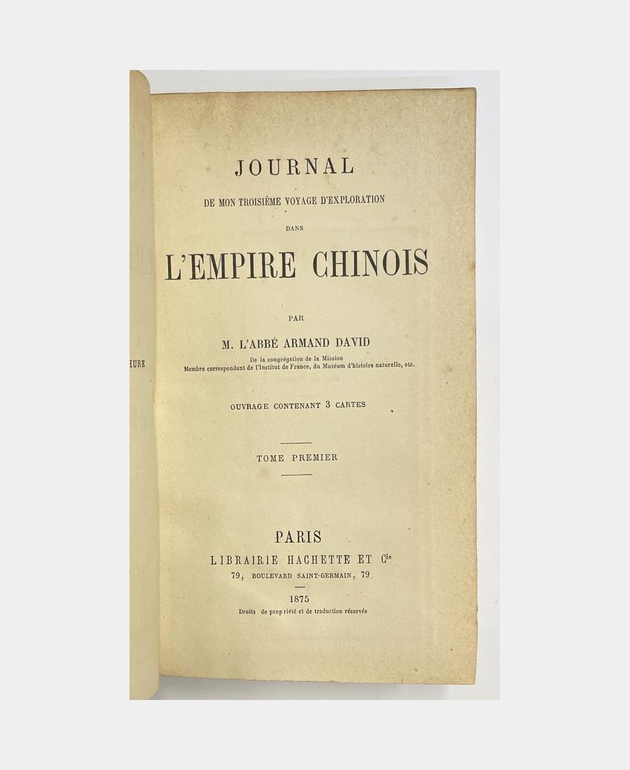 Journal de mon troisième voyage d’exploration dans l’Empire chinois. DAVID (Armand, Abbé). 1875.