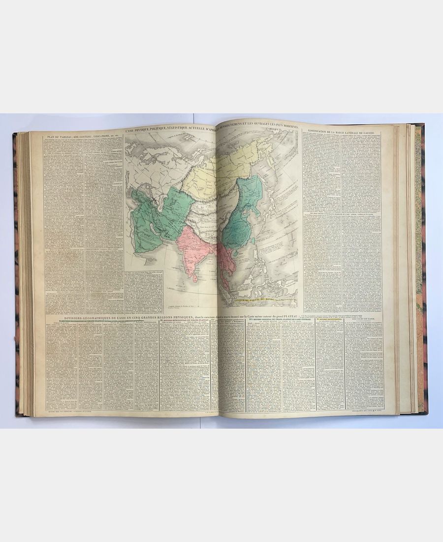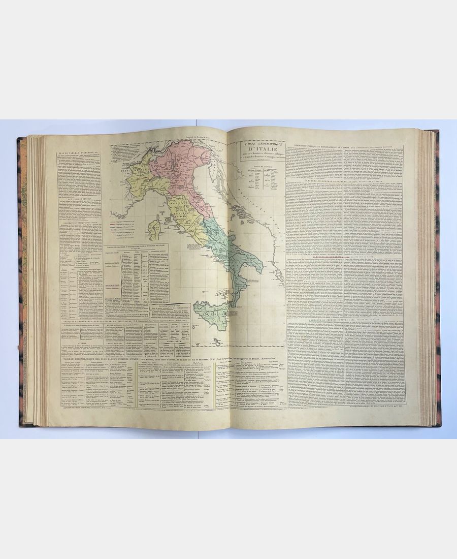 Paris, Leclère, 1829 ; grand in-folio, titre, 1 f.n.p. et 37 planches doubles. Demi-basane rouge, dos lisse titré et daté. Frottements aux mors et aux coiffes, coiffe supérieure fendue. La page de titre et la page d’exposé préliminaire sont tâchées et restaurées, quelques rousseurs et brunissures. Bien complet des 37 planches doubles montées sur onglet dont deux numéros bis (26 et 30) et la planche complémentaire pour l’année 1833. Les planches sont précédées d’un exposé préliminaire de l’éditeur et d’une explication de ces planches. Elles alternent cartes géographiques et tableaux généalogiques agrémentés de couleurs pour une meilleure compréhension et de textes explicatifs.