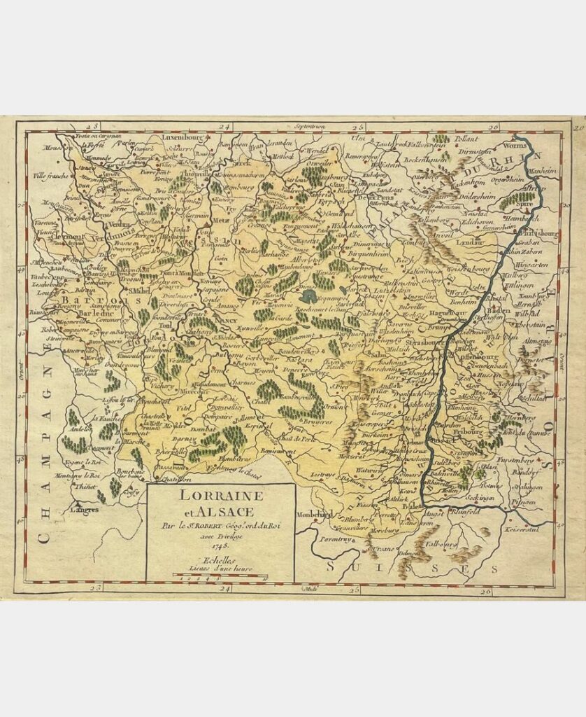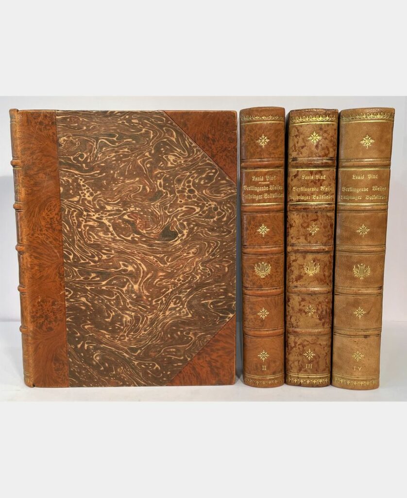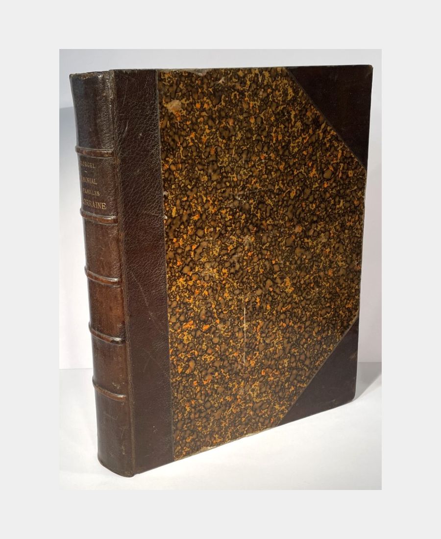 Elbeuf, Chez l’auteur, 1882 ; in-folio de VIII + 718 pp. + 1 p. de rectifications et additions. Demi-maroquin à coins, dos à nerfs, auteur et titre dorés. Rousseurs et mouillure angulaire marginale en début d’ouvrage, coiffe supérieure en partie arrasée sinon bon exemplaire de ce grand classique lorrain d’héraldique et de généalogie orné de 300 écussons dessinés par l’auteur et gravés par E. Deschamps.