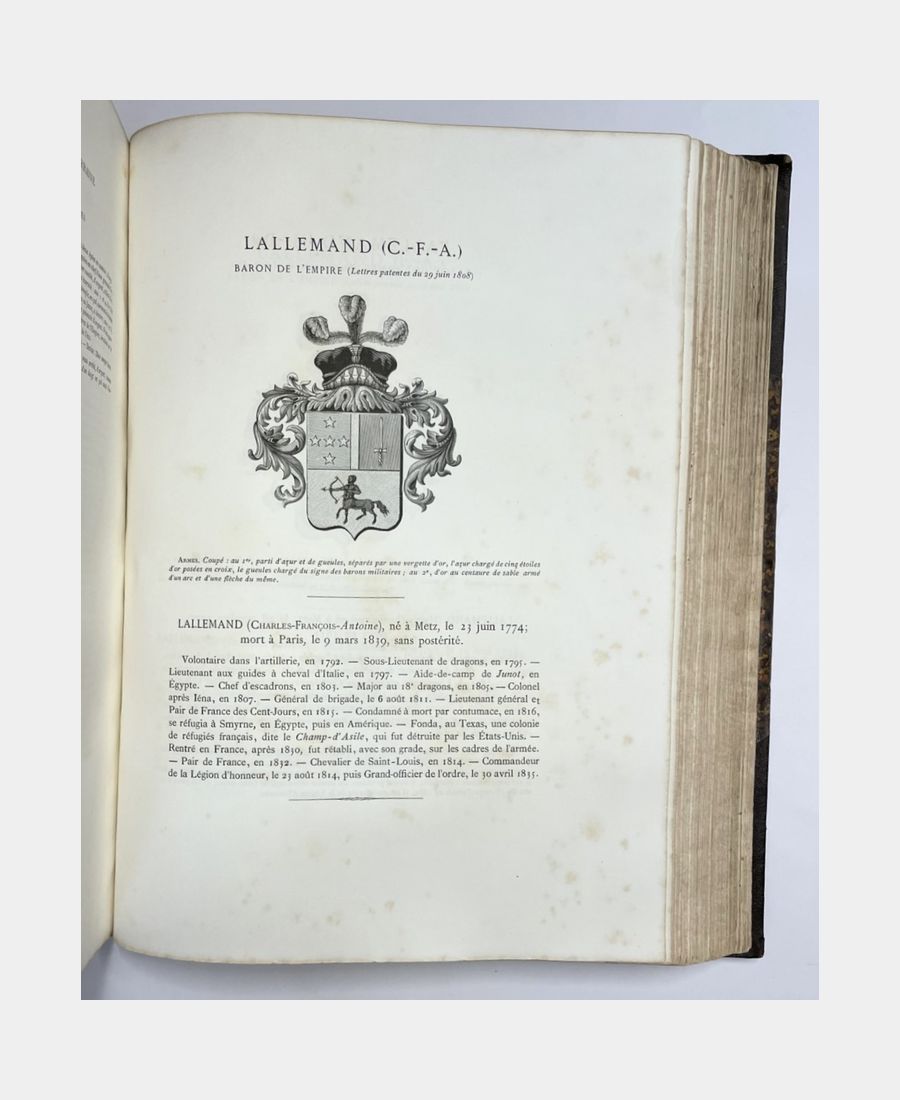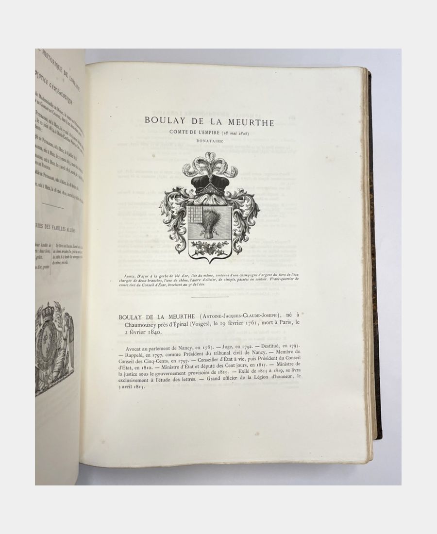 Armorial historique et généalogique des familles de Lorraine titrées ou confirmées dans leurs titres au XIXe siècle renfermant les Titres Impériaux et Royaux, les Pairs héréditaires, les Majorats ainsi que les Généraux, les Préfets et les Evêques qui commandèrent ou administrèrent cette province comprenant en outre, 1° Un extrait chronologique de la législation sur les titres, depuis 1806, 2° Un traité de la composition des armoiries sous l’Empire, 3° Une notice complète sur l’Arc de Triomphe de l’Etoile, 4° Un armorial des maréchaux et amiraux de France, au XIXe siècle et divers autres documents historiques concernant la Lorraine moderne. GEORGEL (Joseph Alcide). 1882.