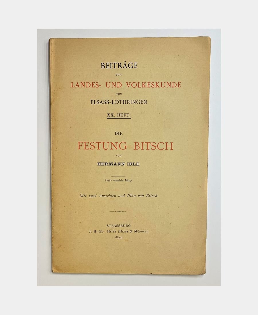Strasbourg, J. H. Ed. Heitz (Heitz & Mündel), 1894 ; in-8 broché de 39 pages, couverture imprimée. Rousseurs éparses. Deuxième édition augmentée de cet ouvrage sur l’histoire de la citadelle de Bitche. Bien complet des deux vues et du plan de la citadelle in fine. XXème étude des « Beiträge zur Landes und Volkeskunde von Elsass-Lothringen und den Angrenzenden Gebieten ».