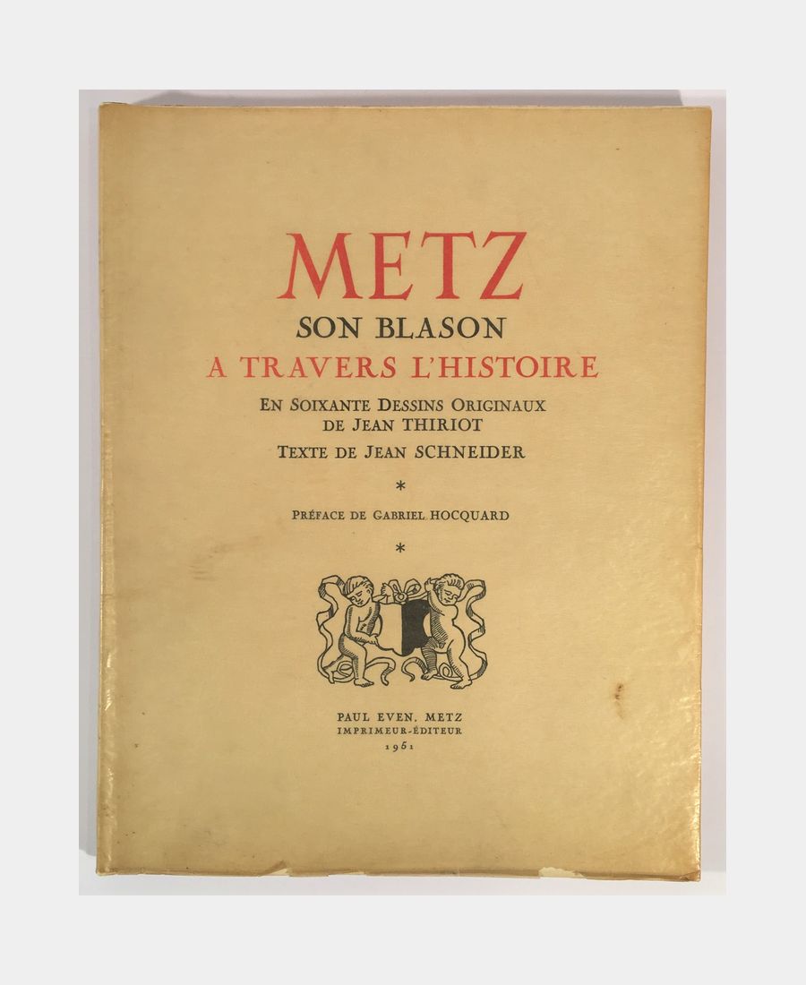 Metz, Paul Even, 1951 ; in-folio broché de 79 pages. Un des 400 exemplaires sur papier Pur Chiffon, le numéro 58, illustré d’armoiries et compositions de Jean Thiriot. Bon exemplaire.