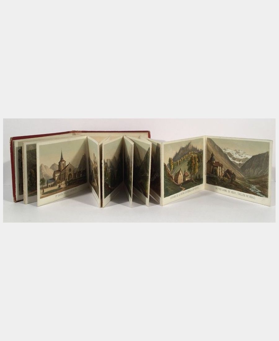 Paris, Sinnet, 1860 ; in-12 oblong (113 x155 mm). Cartonnage rouge titré sur le plat. Album dépliant complet de ses 24 lithographies de Charles MERCEREAU, imprimées en sépia et finement coloriées à la main (10cm x 14 cm). Vues de Tarbes, Bagnères de Bigorre, Baudéan, Campan, Barèges, Luz, Saint Sauveur, Soulom, Saint Salvin, Beaucens, Argelès, Lourdes, Cauterets. Coloris d’une grande qualité avec des nuances de tons dans les feuillages. Charles Mercereau, né à Tarbes en 1822 et mort à Paris en 1864, était un dessinateur de vues et de paysages qui a collaboré à la réalisation d’albums tels « Ponts et cascades des Pyrénées », « La France de nos jours ». Petite fente à un mors du cartonnage, intérieur très frais, sans rousseur.