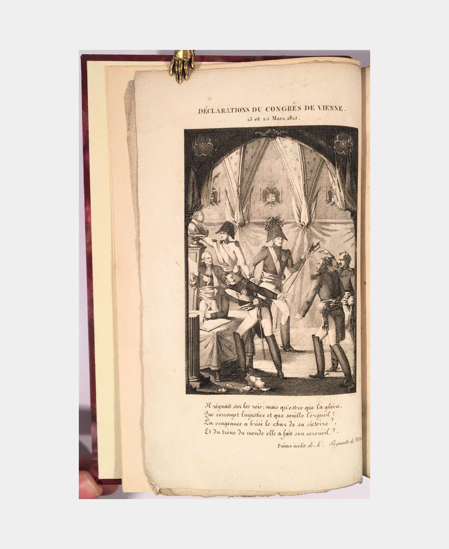 Paris, Plancher, Eymery, Delaunay, Panckoucke, 1815 ; in-8 de VIII et 450 pages. Demi-veau bordeaux moderne, dos à 5 nerfs, auteur et titre dorés. Frontispice illustrant les Déclarations du Congrès de Vienne. 13 et 25 Mars 1815. Non rogné. Rousseurs éparses, légère auréole marginale sur une dizaine de pages sinon intérieur frais. Bel exemplaire.