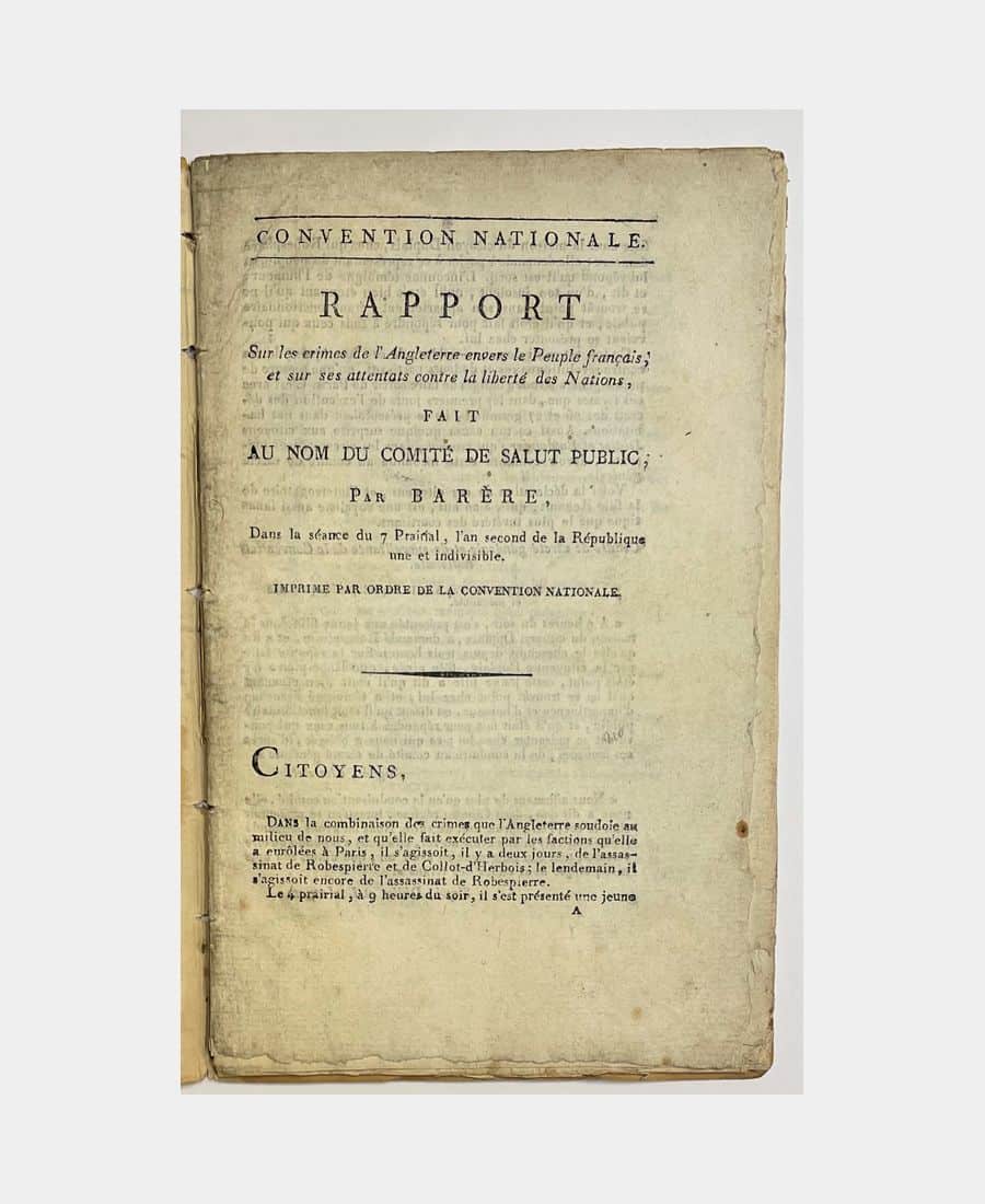 Convention Nationale. Rapport sur les crimes de l’Angleterre envers le peuple français, et sur ses attentats contre la liberté des nations (…) séance du 7 prairial, l’an second de la République une et indivisible.