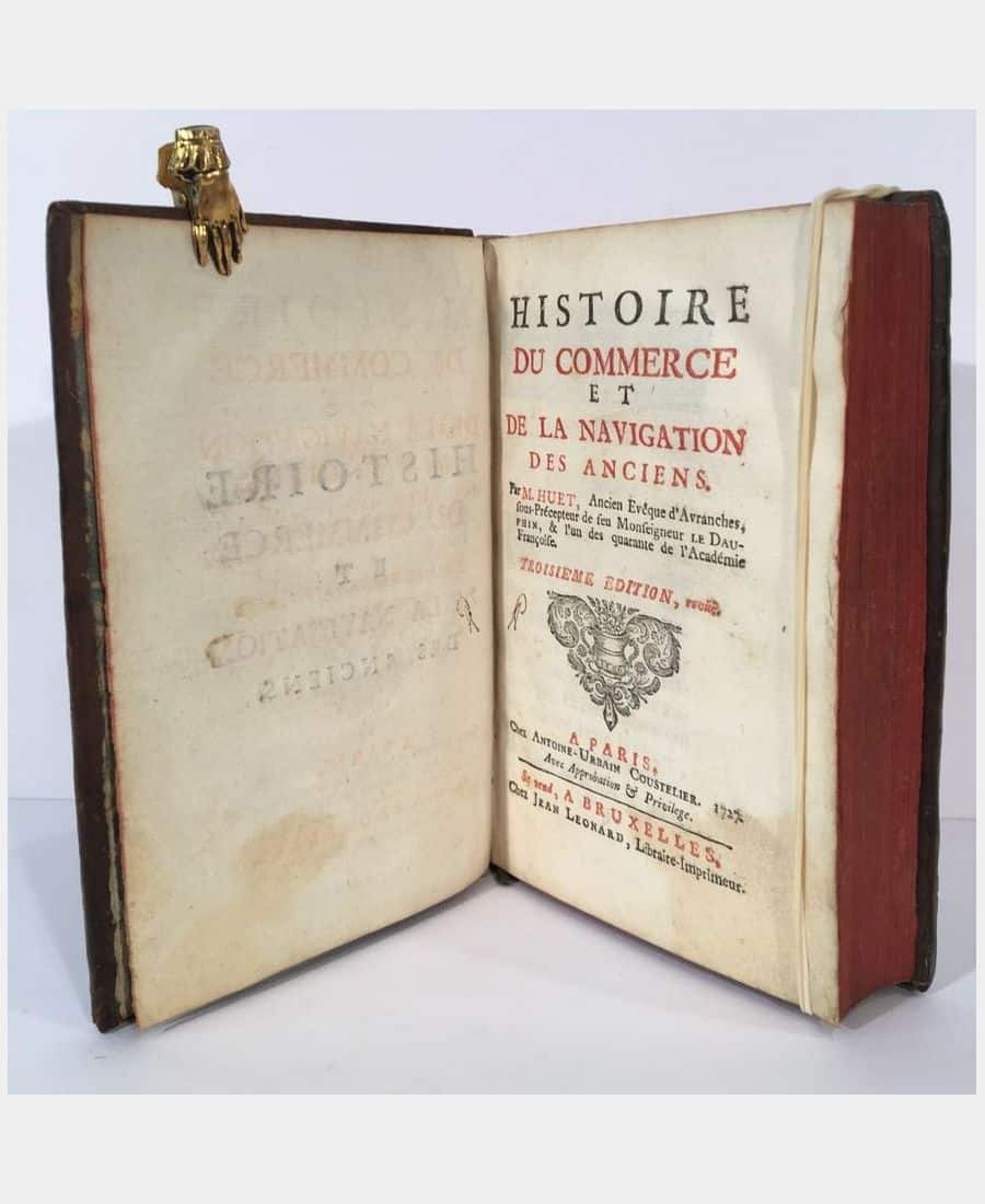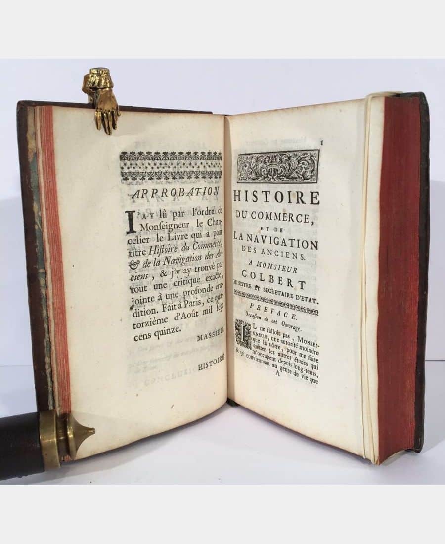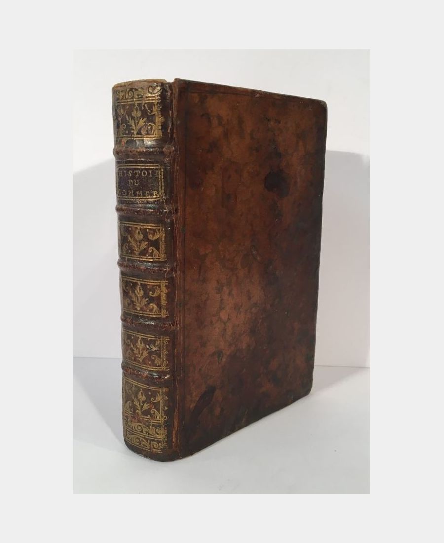 Paris, Coustelier, 1727 ; grand in-16, 16 f. n. ch. (faux-titre, titre, avertissement et table des chapitres), 400 pp., 35 f. n. ch. (table des matières). Plein veau marbré d’époque, dos à 5 nerfs orné de caissons à fleur, pièce de titre. Troisième édition de cet ouvrage traitant de l’histoire du commerce pendant l’Antiquité. Coiffe supérieure arasée, mouillures dans l’angle inférieur sur une dizaine de pages.