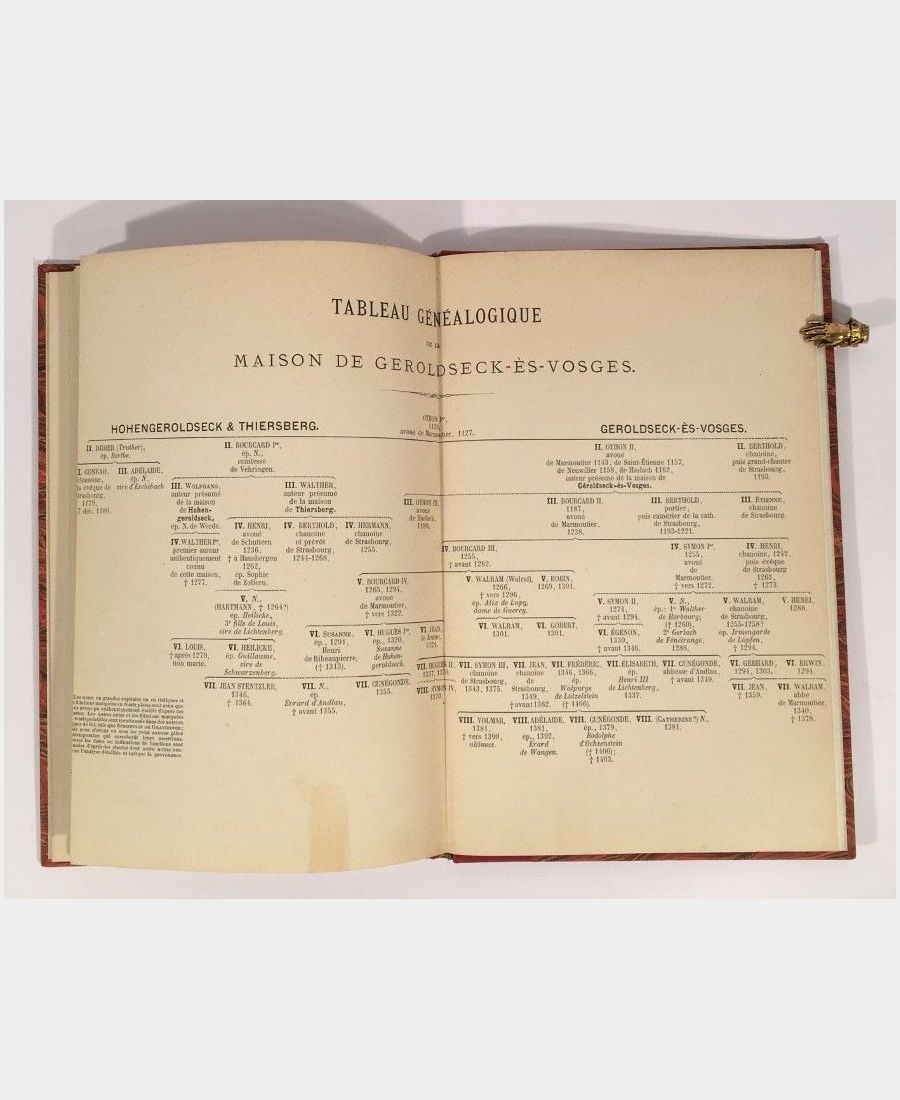 Strasbourg, 1870. Grand in-8 (267x176mm), 47 pp. Demi-toile rouge, reliure à la Bradel, dos lisse avec pièce de titre rouge. Dos légèrement insolé. Marge gauche coupée courte du tableau généalogique. Etude historique et généalogique. Bien complet de sa carte de la marche de Marmoutier ou seigneurie de Geroldseck, du tableau généalogique et des deux fac-simile de sceau. Ouvrage rare.