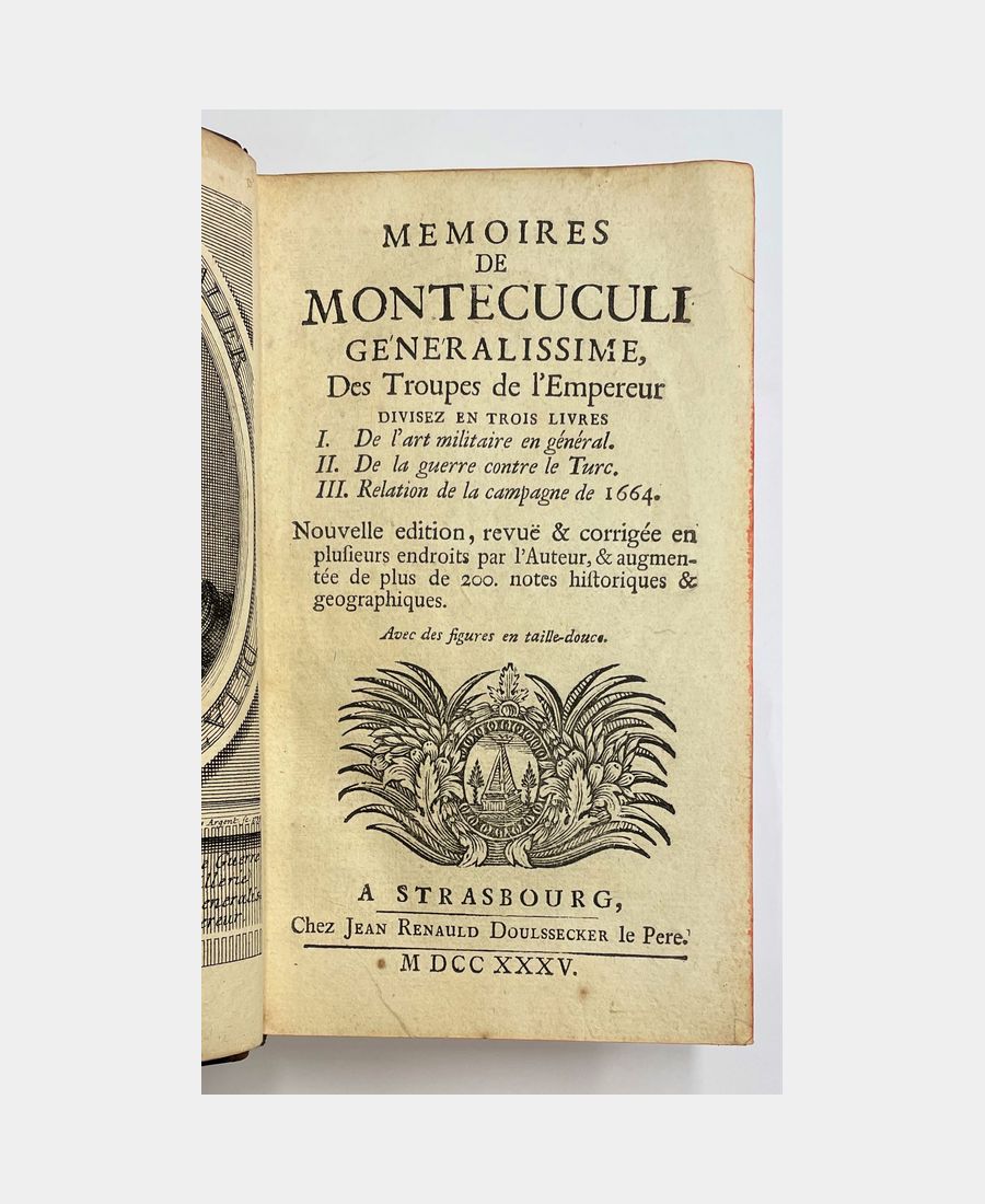 Memoires de Montecuculi, Generalissime des Troupes de l’Empereur, divisez en trois livres. I. De l’art militaire en général. II. De la guerre contre le Turc. III. Relation de la campagne de 1664. Nouvelle edition, revuë & corrigée en plusieurs endroits par l’Auteur, & augmentée de plus de 200. notes historiques & géographiques.