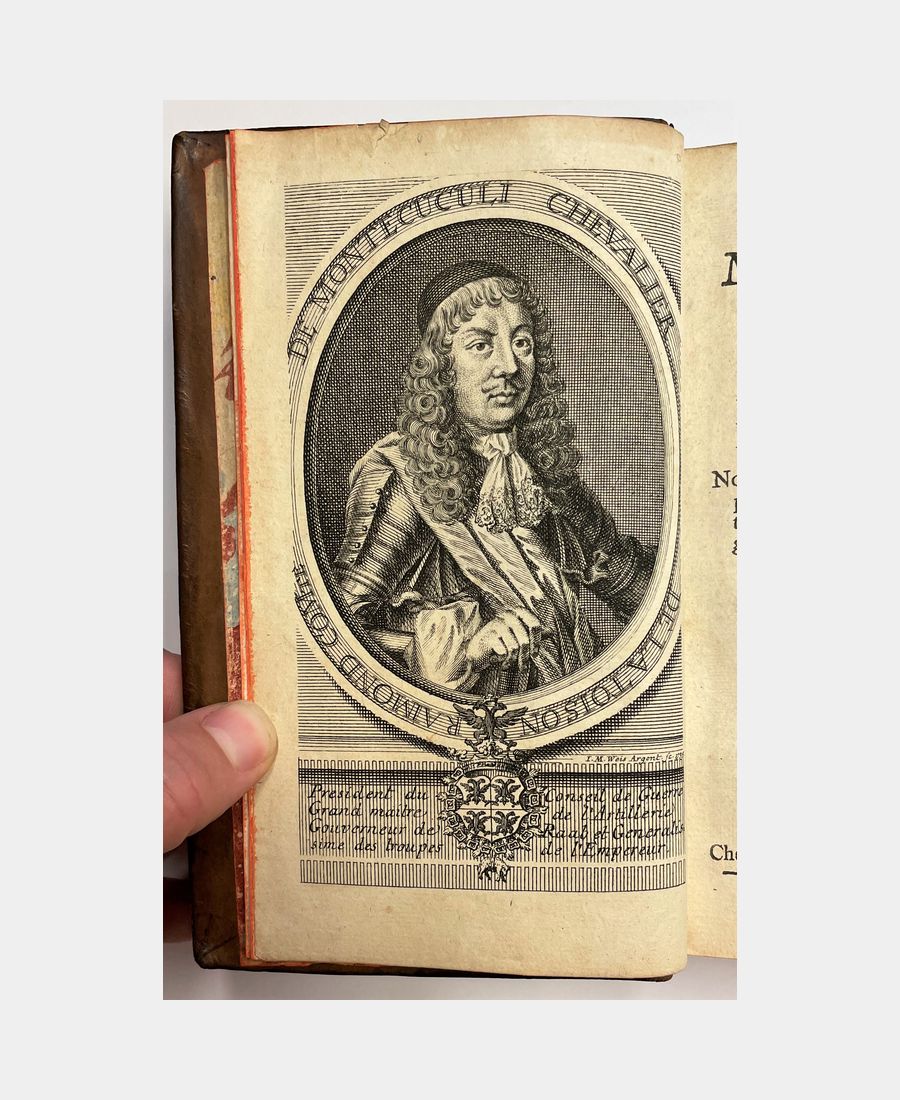 Strasbourg, chez Jean Renauld Doulssecker le Père, 1735 ; in-12, frontispice, page de titre, 3 f. d’épitre, 4 f. d’avertissement, 469 pages, 9 f. de tables. Plein veau, dos à 5 nerfs, filets dorés, pièce de titre, date et lieu d’édition en queue. Quelques épidermures, sur le dos notamment, annotations au crayon. Première éditon strasbourgeoise de cet important ouvrage du Généralissime Montecuccoli traitant de l’art militaire et de la guerre contre les Turcs (la bataille de Saint-Gothard en Hongrie notamment). Bel exemplaire bien complet des 3 planches dépliantes.