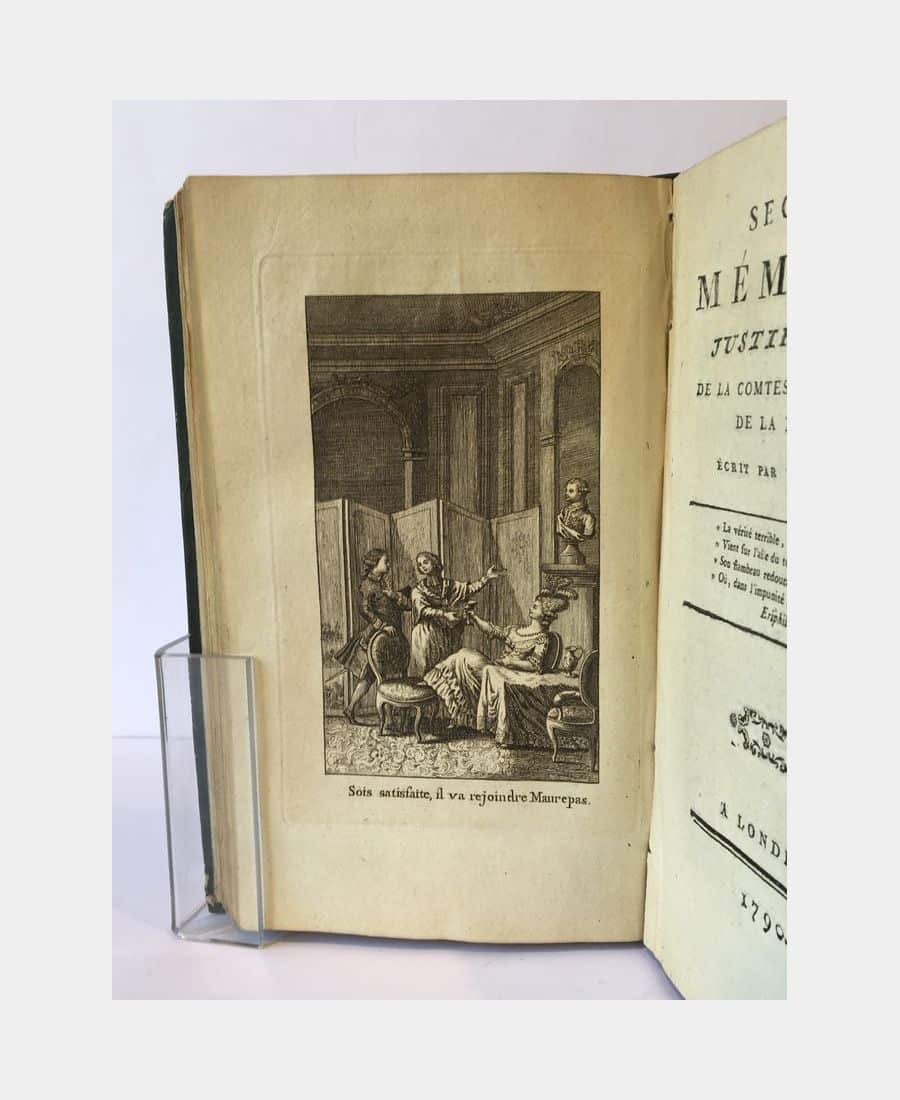 MEMOIRES JUSTIFICATIFS DE LA COMTESSE DE VALOIS DE LA MOTTE, ECRITS PAR ELLE-MEME. Londres, s.n., 1789 ; in-12 (199 x 120 mm) de 204 pp. Suivi du SECOND MEMOIRE JUSTIFICATIF DE LA COMTESSE DE VALOIR DE LA MOTTE ECRIT PAR ELLE-MEME. Londres, s.n. 1790. Frontispice, titre, 40 pp. Suivi de REPONSE POUR LA COMPTESSE DE VALOIS LAMOTTE AU MEMOIRE DU COMTE DE CAGLIOSTRO. Paris, s.n., 1786. 40 pp. Cartonnage vert d’époque à dos titré comprenant trois livres en un volume. Jeanne de Luz, de Saint Rémy, de Valois, comtesse de La Motte s’est rendue célèbre par l’affaire du collier de Marie-Antoinette et à l’ascendant qu’elle possédait sur le Cardinal de Rohan. Dans ses Mémoires, éditées à Londres où elle s’était réfugiée, elle accuse formellement Marie-Antoinette de complicité dans cette affaire. Ce pamphlet, dont l’édition entière fut rachetée à prix d’or par la Cour de France, fut néanmoins réimprimé plusieurs fois sous un autre titre « Vie de la Comtesse de La Motte ». Mors fendus, un livret du second mémoire est en parti dérelié. Intérieur très frais. Ensemble rare.