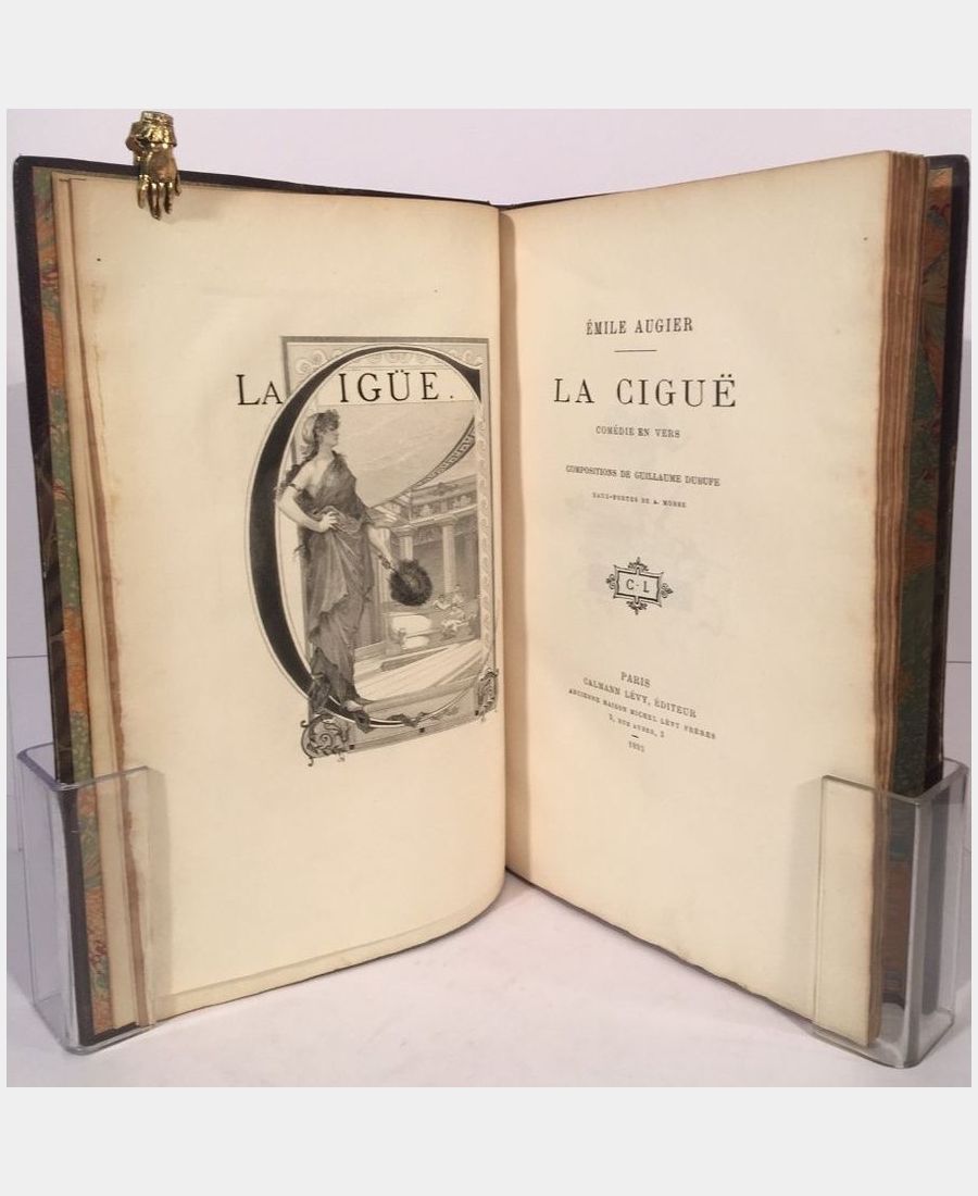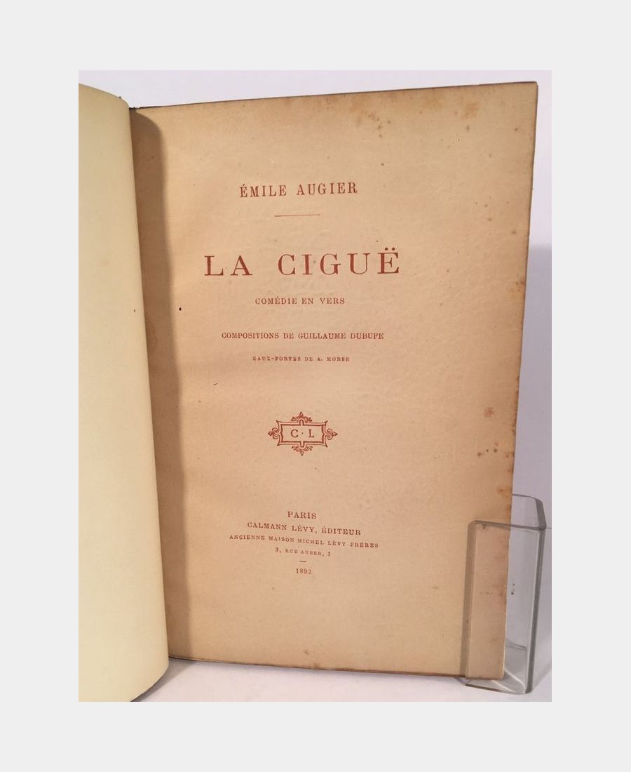 Paris, Calmann Lévy, 1893 ; in-8 (250x168mm), 81 pp.. Demi-maroquin signé Pagnant, dos à nerfs, pièce de titre et caissons ornés. Cet ouvrage a tiré à 300 exemplaires numérotés sur papier vélin de cuve. Notre exemplaire est le n° 64, la couverture et le dos d’origine ont été conservés. Comédie en deux actes en vers, illustrées de 8 compositions de Guillaume Dubufe gravées à l’eau-forte par A. Morse. Les plats sont légèrement frottés sinon bel ouvrage bien relié et illustré.