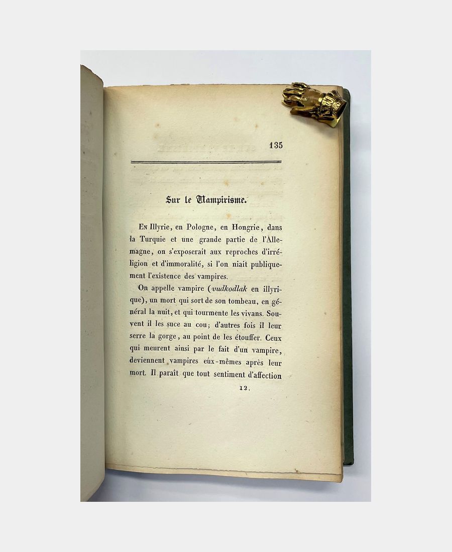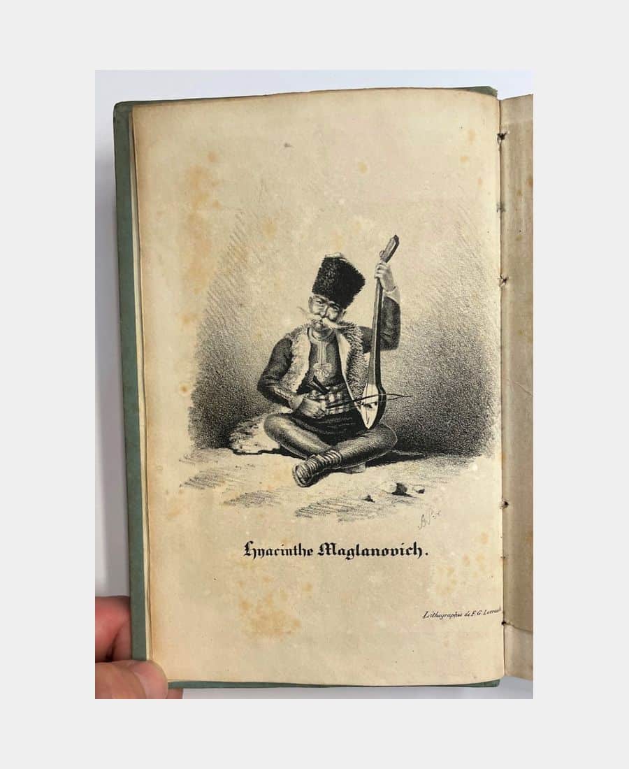 Paris et Strasbourg, F. G. Levrault, 1827 ; in-12 de XII et 257 pages. Cartonnage lithographié de l’éditeur sur les plats et le dos. Insolations, rousseurs éparses et les 6 premiers feuillets oxydés. Bien complet du frontispice lithographié représentant Hyacinthe Maglanovich, poète imaginaire de ballades illyriques, en joueur de guzla. Recueil de ballades balkaniques inventées par Mérimée.