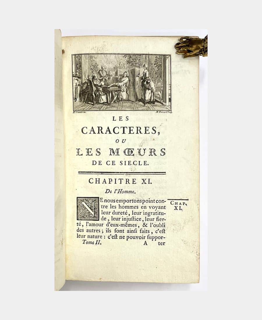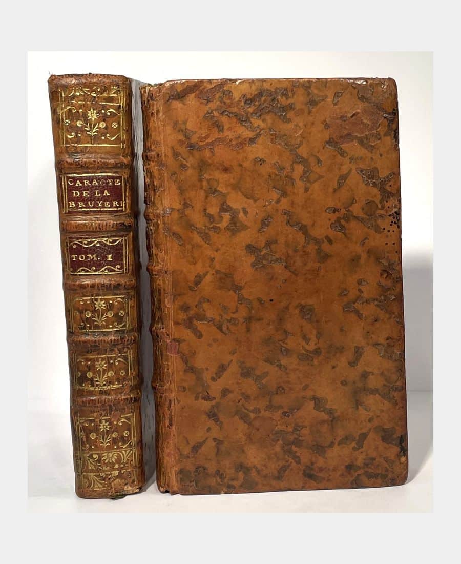 Paris, Laurent Prault, Bailly, 1769 ; 2 volumes in-12 de 2 ff.n.ch. + XLVIII + 479 pp. + 2 ff.n.ch. + 563 pp.. Plein veau marbré de l’époque, dos à nerfs, caissons dorés ornés de fleurons, pièces de titre et de tomaison. Une coiffe supérieure et une inférieure rognée, rousseurs. Nouvelle édition d’après l’édition parisienne de 1739. Agrémentée d’un portrait-frontispice de La Bruyère gravé par Pierre Savart d’après Saint-Jean et de vignettes de Fessard d’après Gravelot.