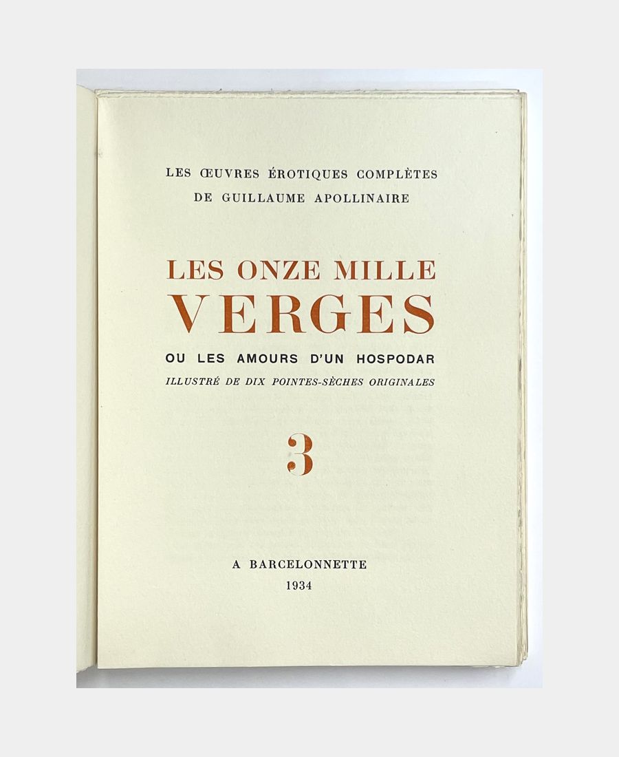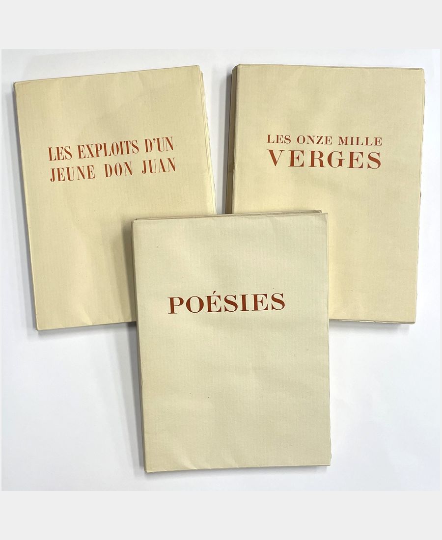 S.n. [Marcel Lubineau], Barcelonnette, 1934 ; 3 tomes en 3 volumes in-12 de 96, 94 et 134 pages en feuilles, sous couverture imprimée repliée, sous étui. Sans la chemise cartonnée, légères auréoles sur les chemises et l’étui. En partie coupé. Tirage limité à 201 exemplaires, un des 200 sur vergé (n°58), illustré de 24 pointes sèches originales en couleur attribuées à Louis Berthommé Saint-André. Préface signée P. P. (Pascal Pia). Ces trois tomes d’Œuvres érotiques complètes comprennent « Poésies – Le Cortège priapique – Julie ou la Rose – le Verger des amours », « Les Exploits d’un jeune Don Juan » et » Les Onze Mille Verges ou les Amours d’un hospodar ».
