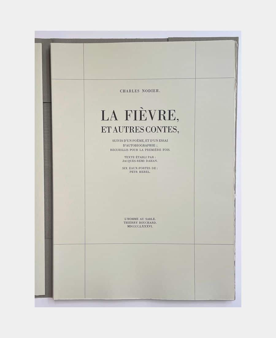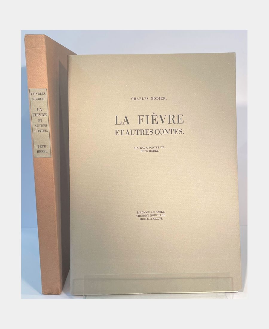La Fièvre, et autres contes, suivis d’un poème et d’un essai d’autobiographie recueillis pour la première fois. Texte établi par : Jacques-Rémi Dahan. Six eaux-fortes de : Petr Herel. Nodier (Charles). Illustré par Petr Herel. 1986.