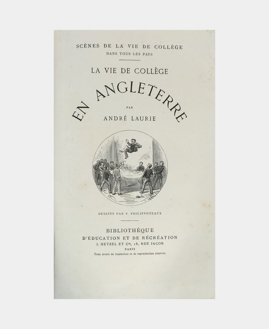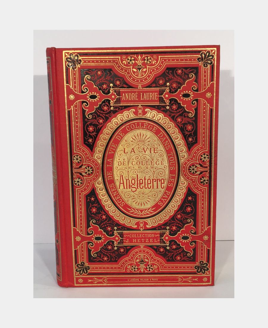 Paris, J. Hetzel et Cie, (1882?) ; in-8 de 294 pages. Collection J. Hetzel, série « Scènes de la vie de collège de tous les pays ». Cartonnage d’éditeur signé Lenègre. Quelques rousseurs sinon beau cartonnage aux ors rutillants.