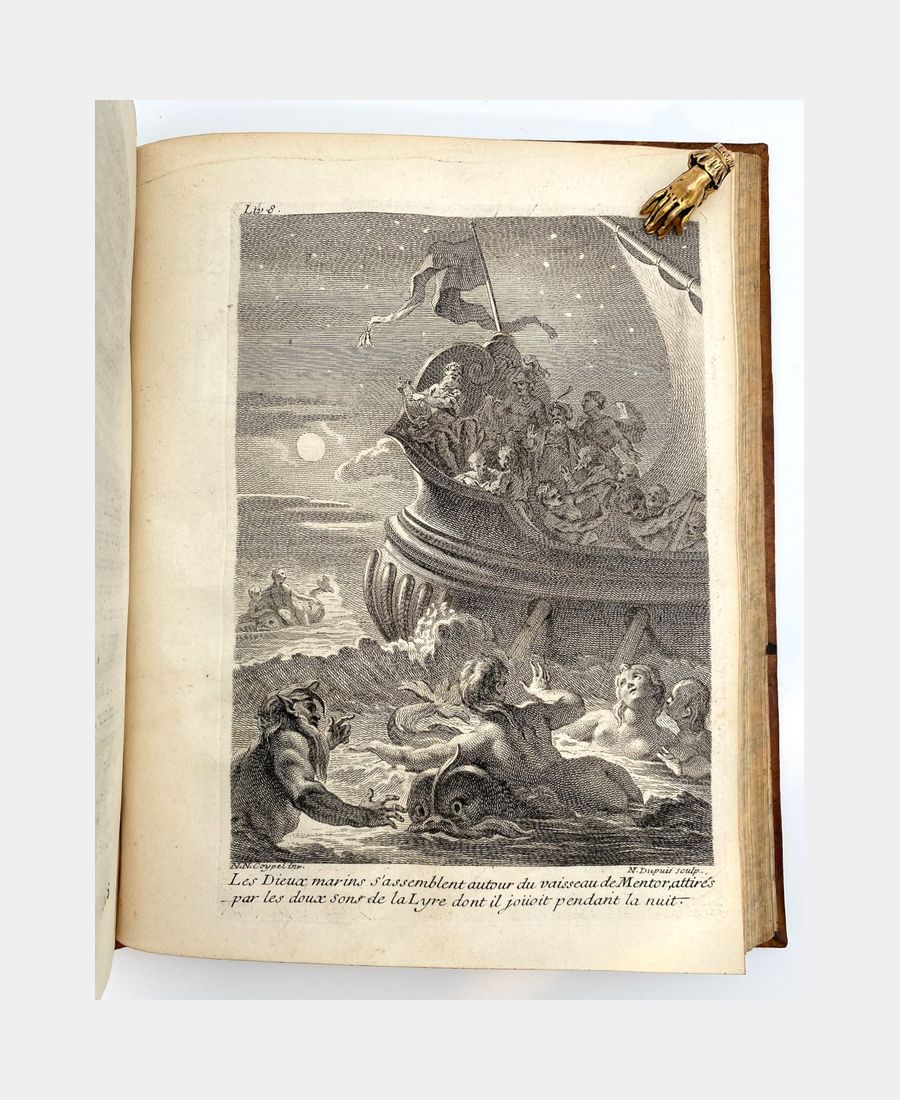 Cohen & De Ricci 379-380. Cette nouvelle édition est enrichie de figures en taille-douce. Le premier tome comprend un frontispice gravé par Tardieu d’après Coypel présentant le portrait de M. de Fénelon sur laquelle la Vertu s’appuie et est soutenu par Minerve tenant les armes du Dauphin et Calliope appuyée sur trois livres symbolisant les trois genres de la Poésie. Ce volume contient également une vignette dans le texte et 12 gravures sur cuivre pleine page et hors texte. Elles sont dessinées par Coypel, Sauville et Favanne, et sont gravées par Tardieu, Lebas, Scotin, Haussard, Favanne, Beauvais, Dupuis. Le second tome est agrémenté de 12 gravures sur cuivre pleine page et hors texte, dessinées par Cazes, Coypel et Humblot et gravées par Lebas, Scotin, Dupuy, Favanne, Bacquois, Mathey. In fine, une carte dépliante retrace le trajet des aventures de Télémaque.