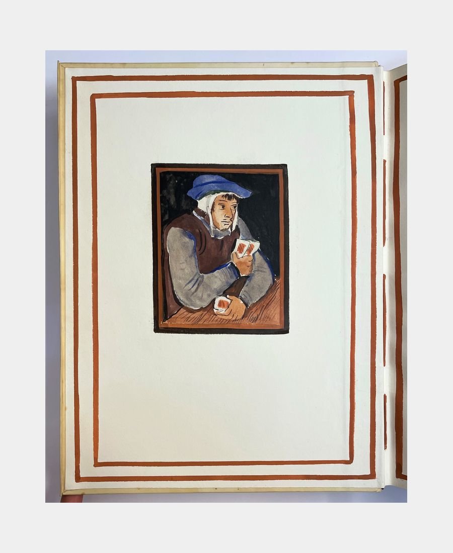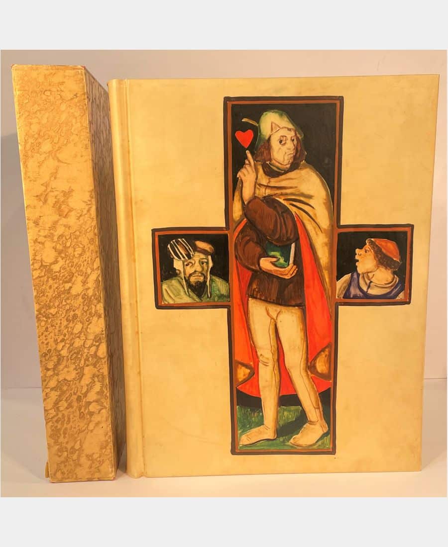 Paris, Editions de la Cigogne, 1931 ; in folio de 4 ff., 135 pages, 4 ff.. Plein velin aux plats et au dos peints à la main par l’artiste, couverture rempliée avec pièce de titre, étui bordé. Légers frottement sur l’étui, petit manque à un mors de la chemise. Préfacé par Pierre Champion et illustré de 64 eaux-fortes de Barta. Tirage à 200 exemplaires, ici un des 150 sur vélin de Rives à la forme. Les plats en vélin et les gardes de cet exemplaire ont été peints à la main par l’illustrateur. Un certificat joint de Barta atteste qu’il a réalisé ce travail uniquement pour cet exemplaire. Laszlo Barta (1902 – 1961), artiste Juif Hongrois, quitta son pays en raison de l’arrivée du nazisme et s’installa en Corse où il participa activement à la résistance. Bel et unique exemplaire dans cette reliure.