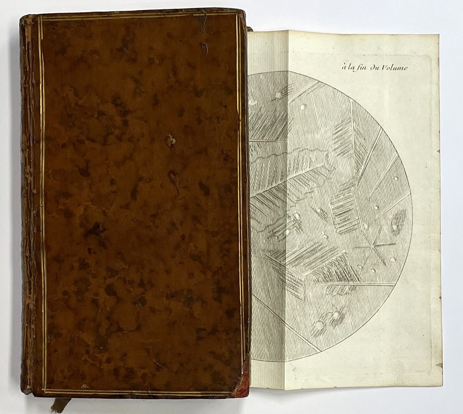 Paris, Imprimerie royale, 1749 ; in-12 de XXIX + 5 f.n.ch. + 384 + XX. Plein veau marbré d’époque, dos à faux nerfs, caissons ornés de fleurons, pièce de titre, filets dorés sur les plats, roulette sur les coupes. Début de fente aux mors supérieurs, manque aux mors et à la coiffe inférieure, au coin inférieur du 1er plat, très légères épidermures. Première édition illustrée bien complète du frontispice et des 5 planches gravées dépliantes in fine de cet ouvrage du mathématicien et physicien Jean-Jacques Dortous de Mairan (1678-1771), membre de l’Académie des sciences et de l’Académie française.