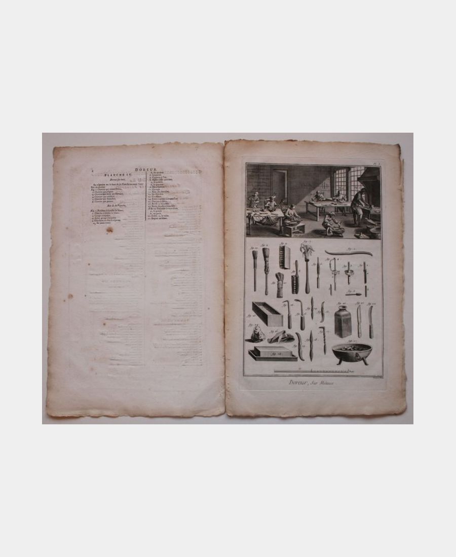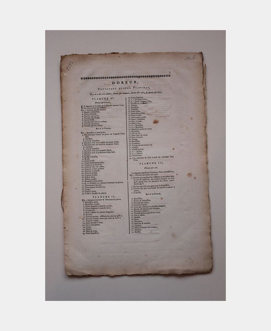 Dossier complet sur le métier de relieur extrait d’un des onze volumes d’illustrations imprimés entre 1762 et 1782 de « L’Encyclopédie ou Dictionnaire raisonné des sciences, des arts & des métiers, par une Société de Gens de lettres » de Diderot et d’Alembert. In folio composé d’une page d’explications des planches suivie des planches gravées (planches I et II par Prévost) : pl. I : « Doreur, sur métaux » pl. II : » Doreur, sur Métaux » pl. III : « Doreur sur Cuir » pl. IV : « Doreur, sur Bois » Elles représentent les outils utilisés par les doreurs. Les planches I, III et IV sont agrémentées de vignettes avec les artisants au travail. Bon état, planche IV : manque du coin supérieur droit sans toucher la cuvette.