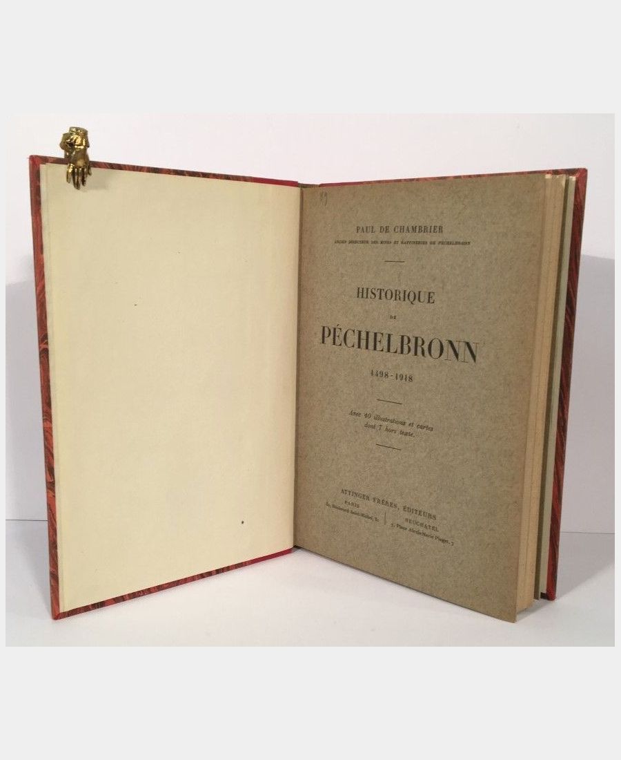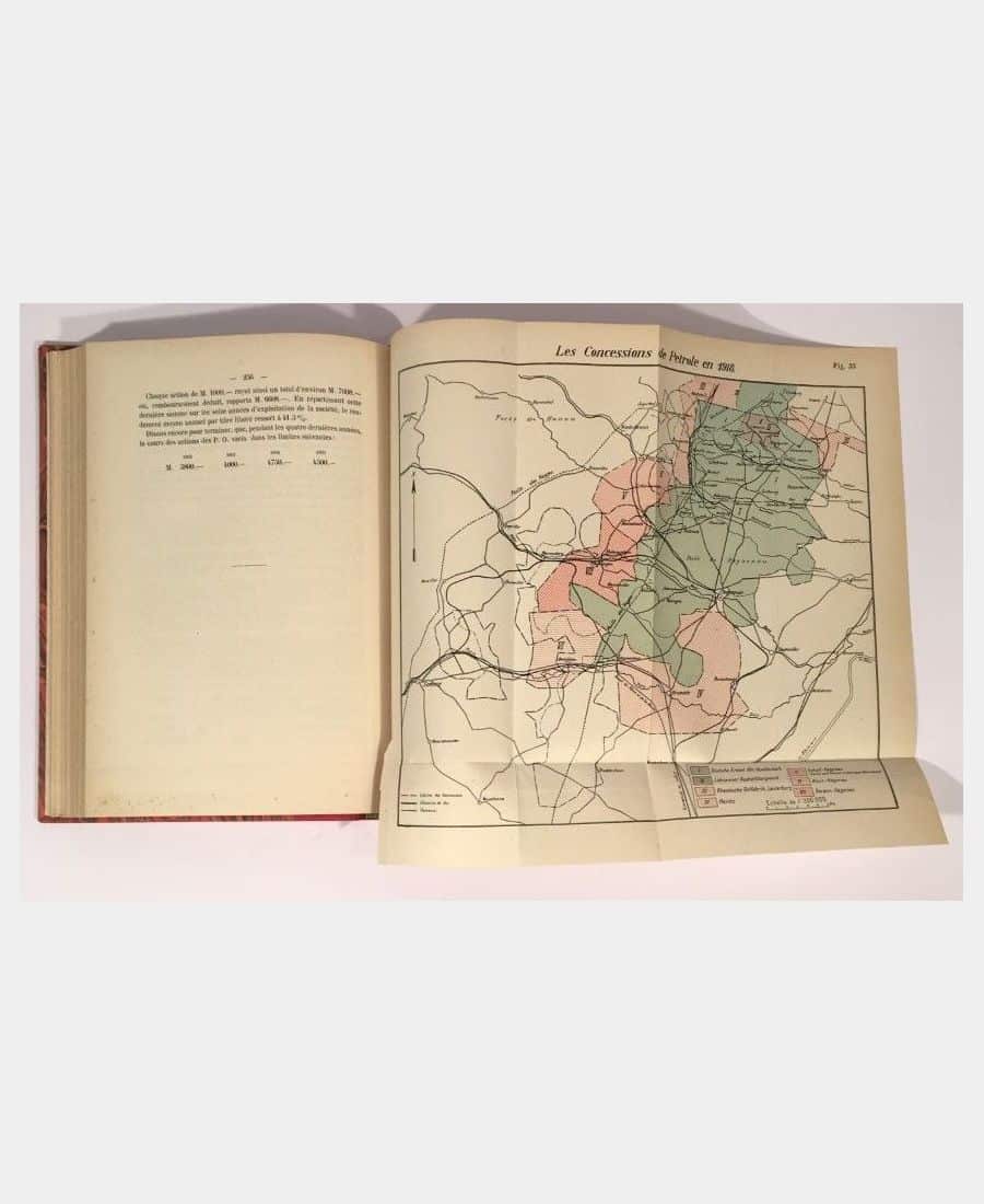 Paris et Neuchâtel, Attinger Frères, 1919. In-8 (235x167mm), XX, 329 pp.. Demi-toile rouge à la Bradel, dos lisse, pièce de titre rouge. Dos légèrement insolé. Couvertures et dos conservés. Paul de Chambrier, ancien directeur des mines et raffineries de Pechelbronn, détaille l’historique de la découverte et de l’exploitation du pétrole à Pechelbronn. Bel exemplaire bien complet de ses 40 ilustrations et cartes dont 7 hors-texte.