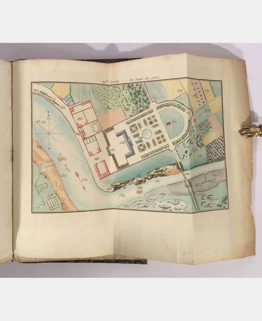 Paris, Audin, 1834 ; in-8 (207 x 137 mm) ; XII, 384 pp.. Ces 20 leçons sont illustrées notamment par 17 planches hors-texte, celle concernant la leçon « Du lavis des plans » colorée à la main et 2 planches de listes de typographies. Reliure d »époque en demi-veau à dos plat titré, orné d’un décor doré et à froid. Légères rousseurs éparses sinon bel exemplaire.