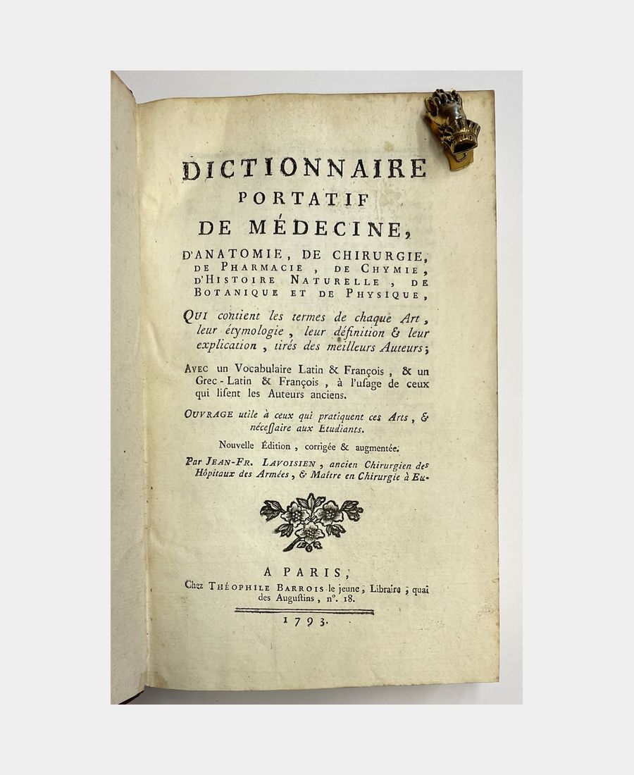 Dictionnaire portatif de médecine, d’anatomie, de chirurgie, de pharmacie, de chymie, d’histoire naturelle, de botanique et de physique. Qui contient les termes de chaque art, leur étymologie, leur définition & leur explication, tirés des meilleurs auteurs. LAVOISIEN (Jean-François). 1793.