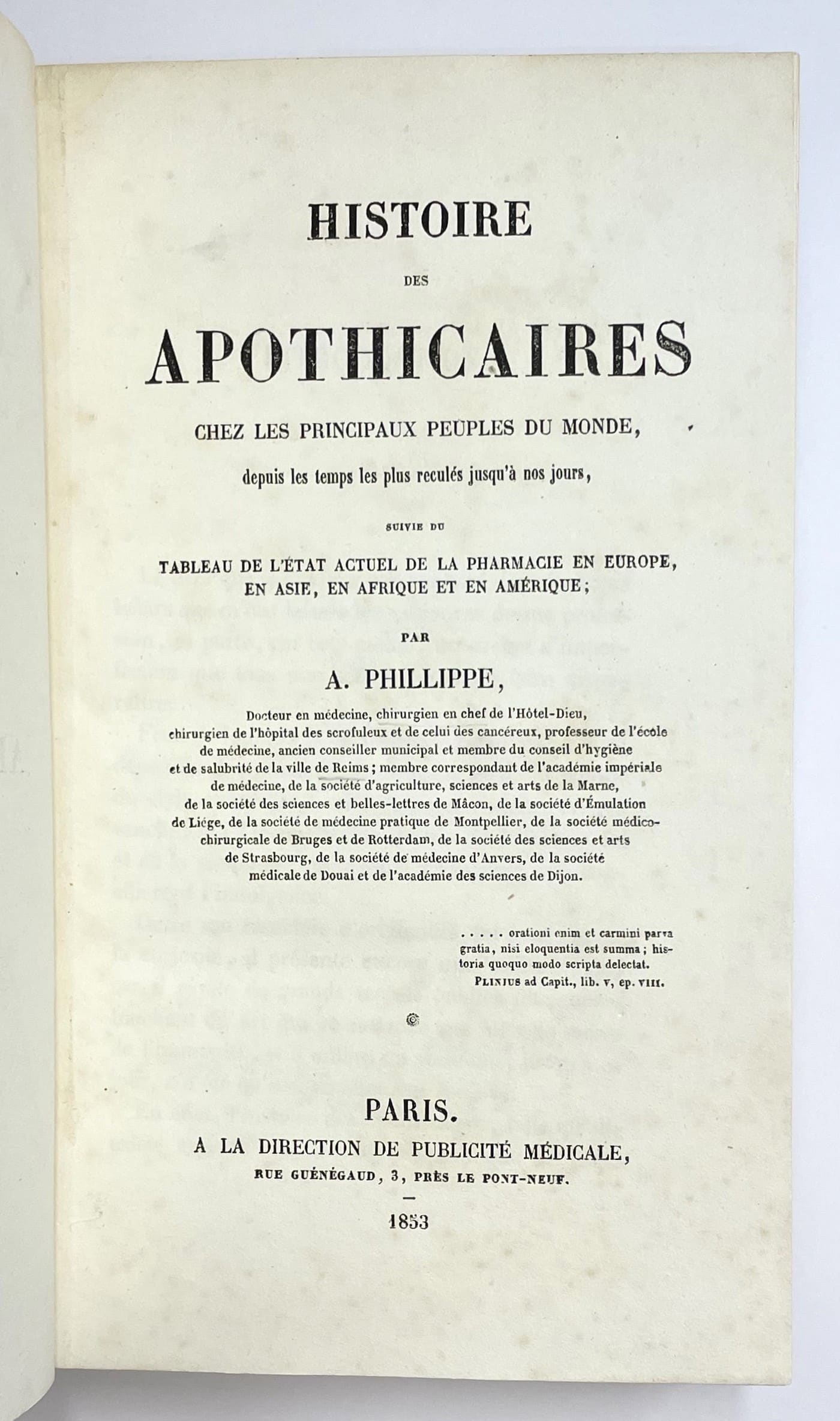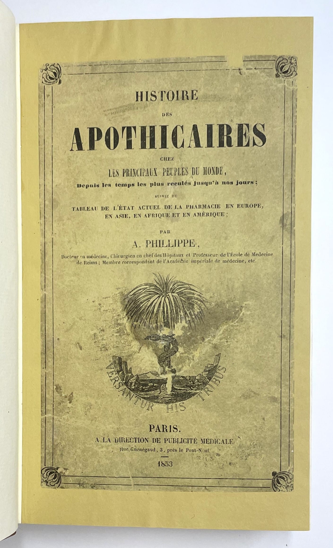 Paris, A la direction de publicité médicale, 1853 ; in-8 de VII, 452 pages. Demi-chagrin postérieur à coins, dos à nerfs, auteur et titre dorés. Dos insolé, quelques annotations au crayon. Histoire des apothicaires chez les principaux peuples du monde, depuis les temps les plus reculés jusqu’à nos jours, suivie du tableau de l’état actuel de la pharmacie en Europe, en Asie, en Afrique et en Amérique. Premier plat de la couverture imprimée conservée. Edition originale bien reliée.