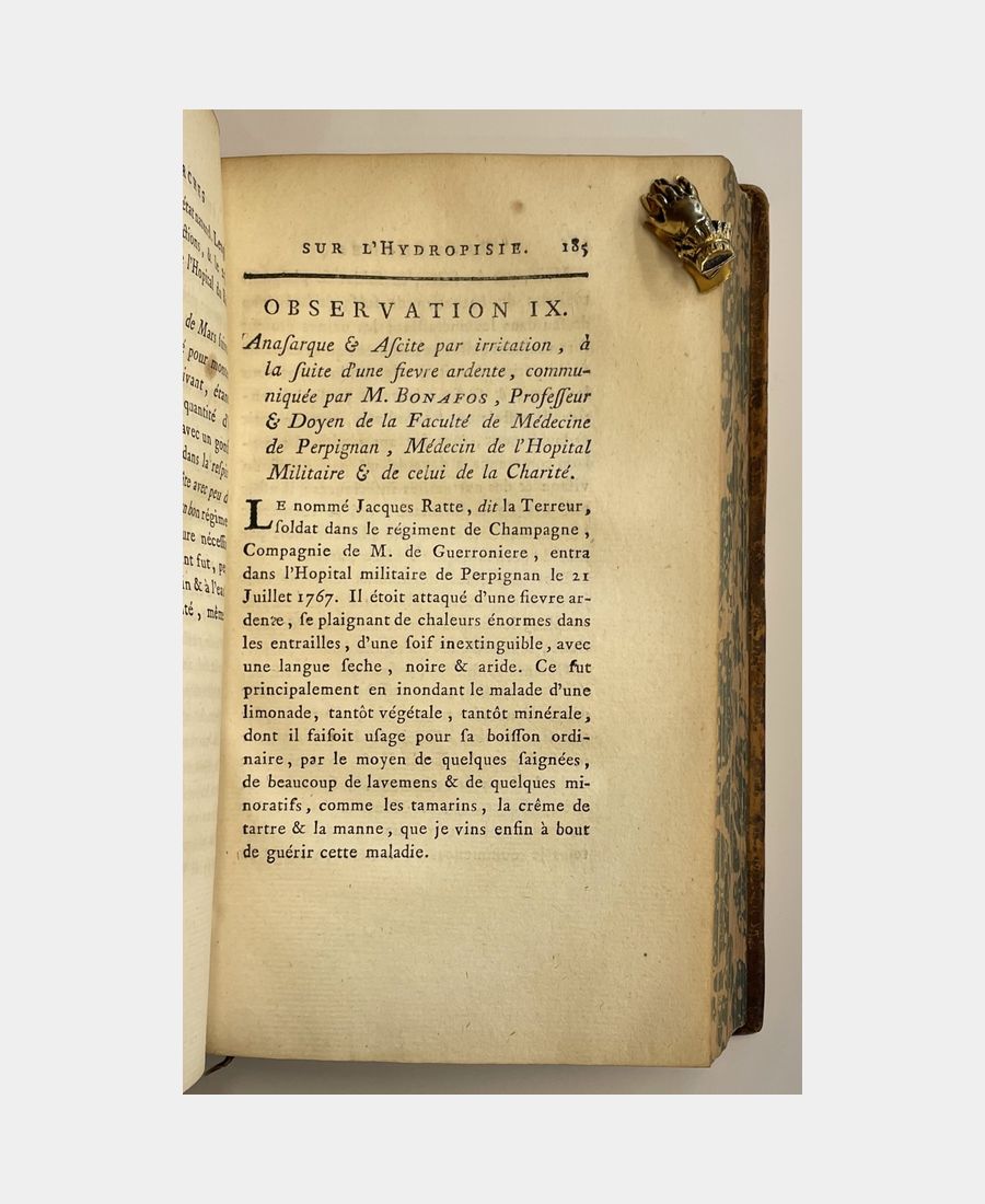 Paris, chez la Veuve Thiboust et Didot le jeune, 1776 ; in-8 de XL + XV + 724 pp + 1 ff. Reliure plein veau d’époque, dos à nerfs et à caissons ornés de fleurons et pièce de titre. Filets d’encadrement dorés sur les plats. Mors légèrement fendus, coiffes restaurées. Georges Frédéric Bacher (Blotzheim, 1709 – Thann, 1798), médecin installé à Thann, fut l’inventeur des « Pillules dites toniques de Bacher ». Cet ouvrage fut achevé par son fils Alexandre (Thann, 1740 – Paris, 1808). Bibliographie des écrits sur l’hydropisie in-fine.