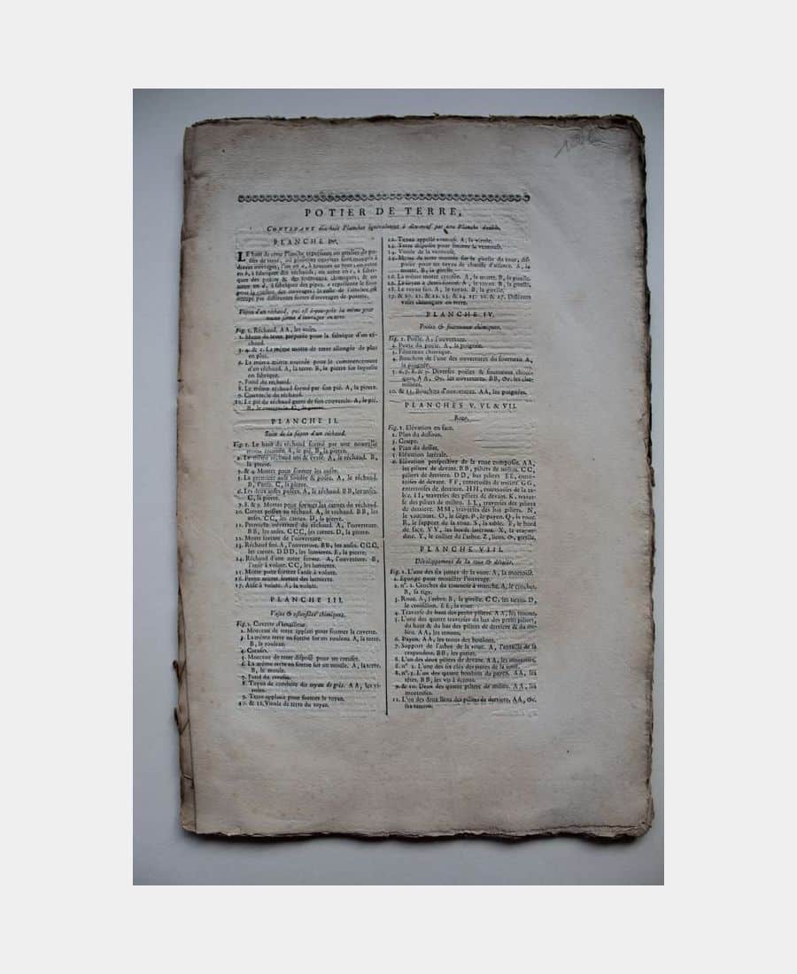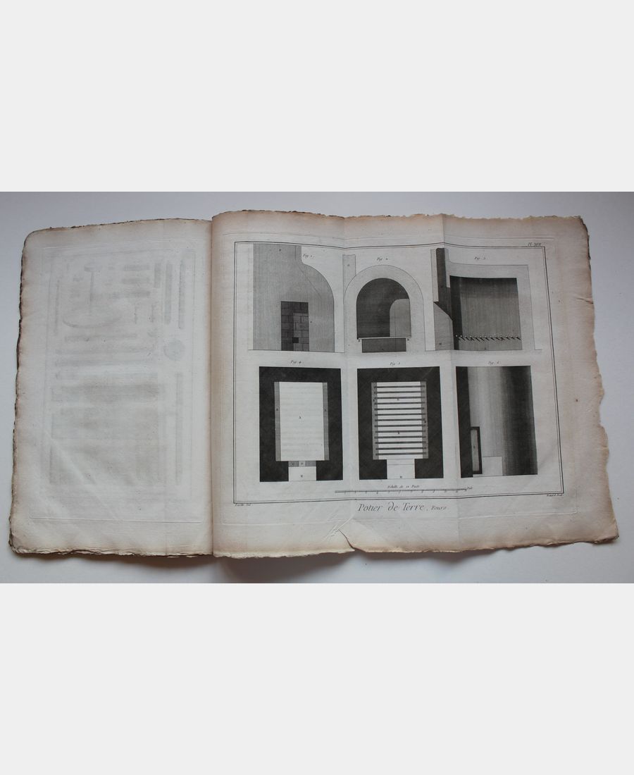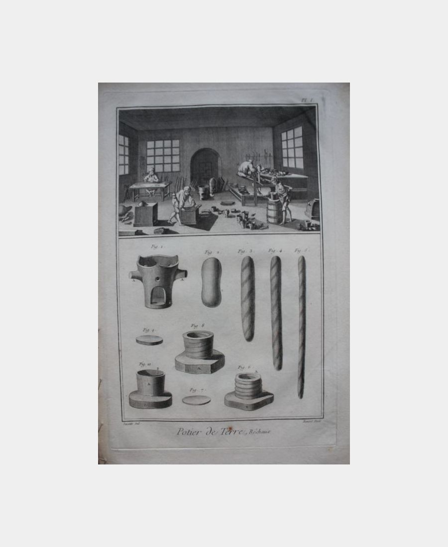 Dossier complet sur le métier de relieur extrait d’un des onze volumes d’illustrations imprimés entre 1762 et 1782 de « L’Encyclopédie ou Dictionnaire raisonné des sciences, des arts & des métiers, par une Société de Gens de lettres » de Diderot et d’Alembert. In folio composé de 2 pages d’explications des planches suivie de 18 planches gravées par Benard d’après des dessins de Lucotte. La première planche est illustrée d’une vignette présentant des potiers dans leur atelier. Les autres planches détaillent les différents instruments, les types de tours et de fours utilisés. pl. I : « Potier de Terre, Réchaux » pl. II : « Potier de Terre, Réchaux. » pl. III : »Potier de Terre, Cuvettes et Vases Chimiques. » pl. IV : « Potier de Terre, Poëles et Fourneaux Chimiques. » pl. V : « Potier de Terre, Roue composée. » pl. VI : « Potier de Terre, Roue composée. » pl. VII : « Potier de Terre, Roue composée. » pl. VIII : « Potier de Terre, Détails de la Roue composée. » pl. IX : « Potier de Terre, Roue simple » pl. X : « Potier de Terre, Roue simple. » pl. XI : « Potier de Terre, Roue simple. » pl. XII : « Potier de Terre, Détails de la Roue simple. » pl. XIII : « Potier de Terre, Tour. » pl. XIV : « Potier de Terre, Tour. » pl. XV : « Potier de Terre, Tour. » pl. XVI : « Potier de Terre, Détails du Tour. » pl. XVII (dépliante) : « Potier de Terre, Four. » pl. XVIII : « Potier de Terre, Outils et Pipes. »