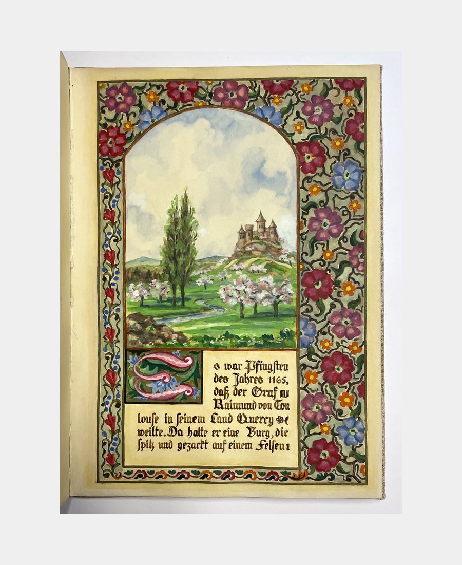 [Manuscrit] Jaufré und Mélisande. Eine Troubadourgeschichte von Paul Ernst. Sn, sl, sd. In-4, 5 ff.n.ch.. Pleine toile beige, dos muet. Livre entièrement manuscrit et aquarellé racontant l’histoire de Jaufré Rudel, poète et prince de Blaye, troubadour qui parti en croisade pour Mélisande, princesse de Tripoli. Les 4 feuillets de texte manuscrit en allemand sont enluminés de lettrine et d’encadrements floraux, géométriques et historiés.